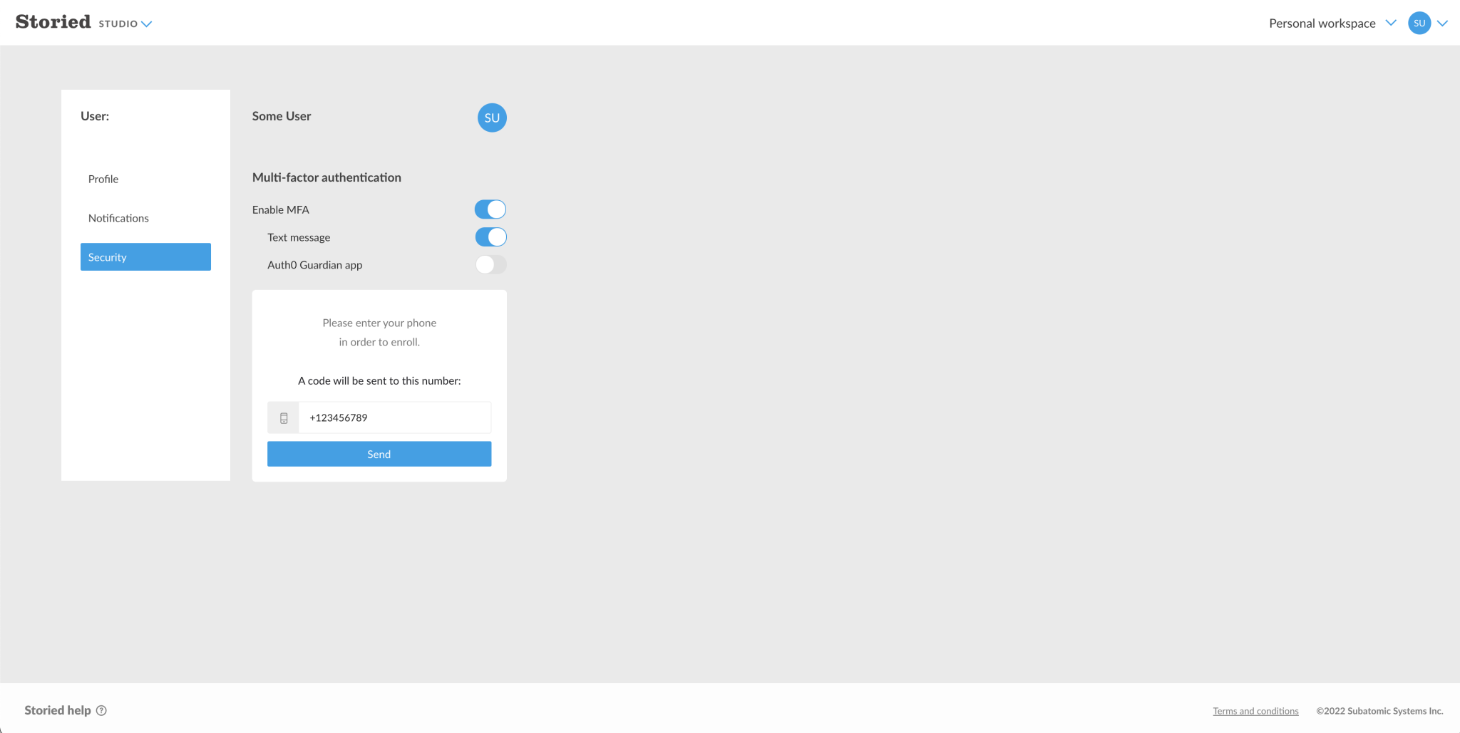 5. Once you have completed the setup process log out of Storied and log back in. You will now be prompted verify your identity by entering a verification code sent to your device.