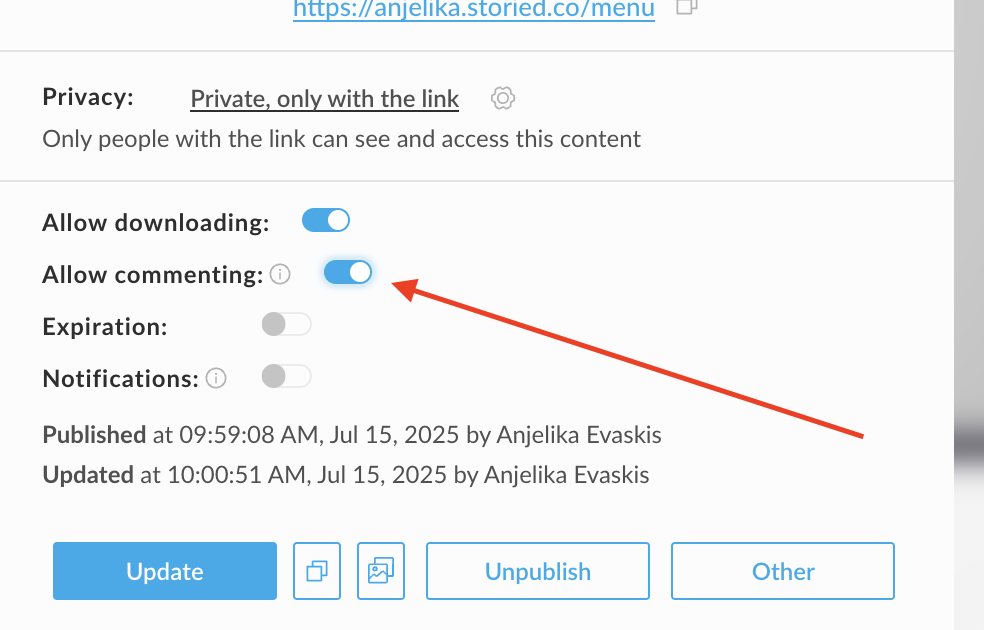 This will activate the commenting functionality on your live project. Refer to the screenshot above for visual guidance.