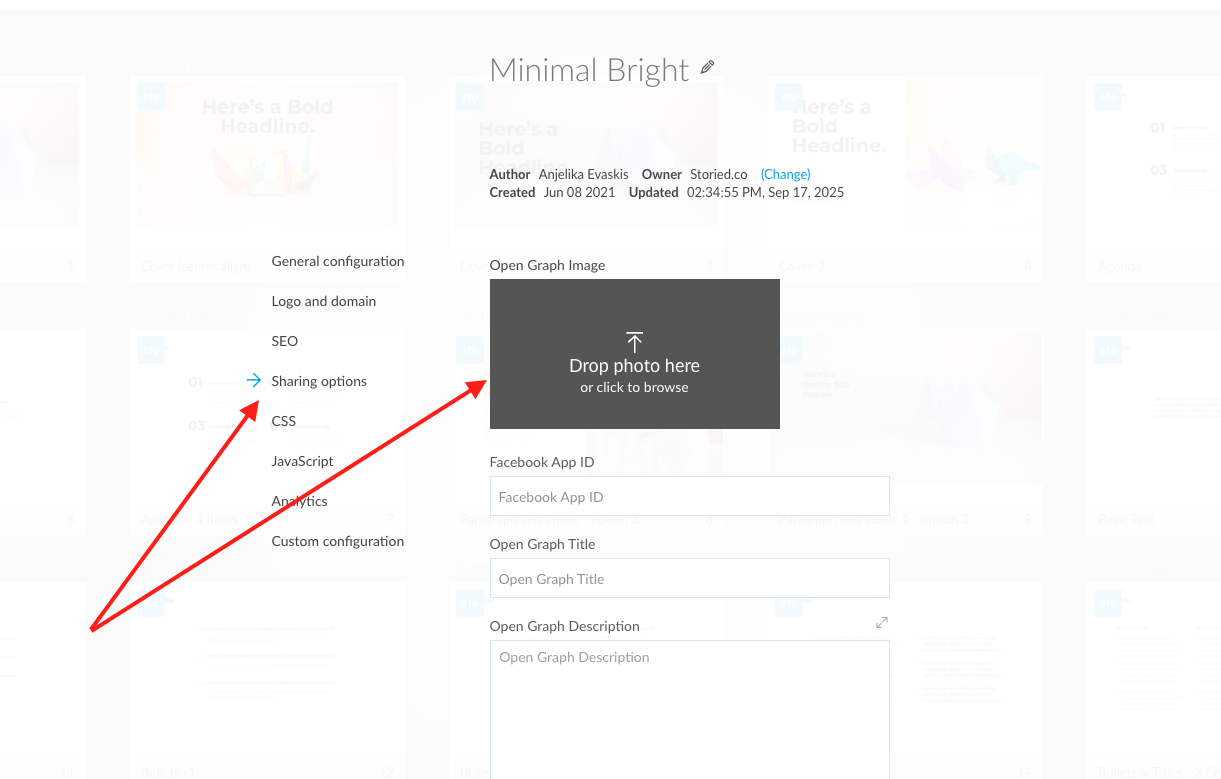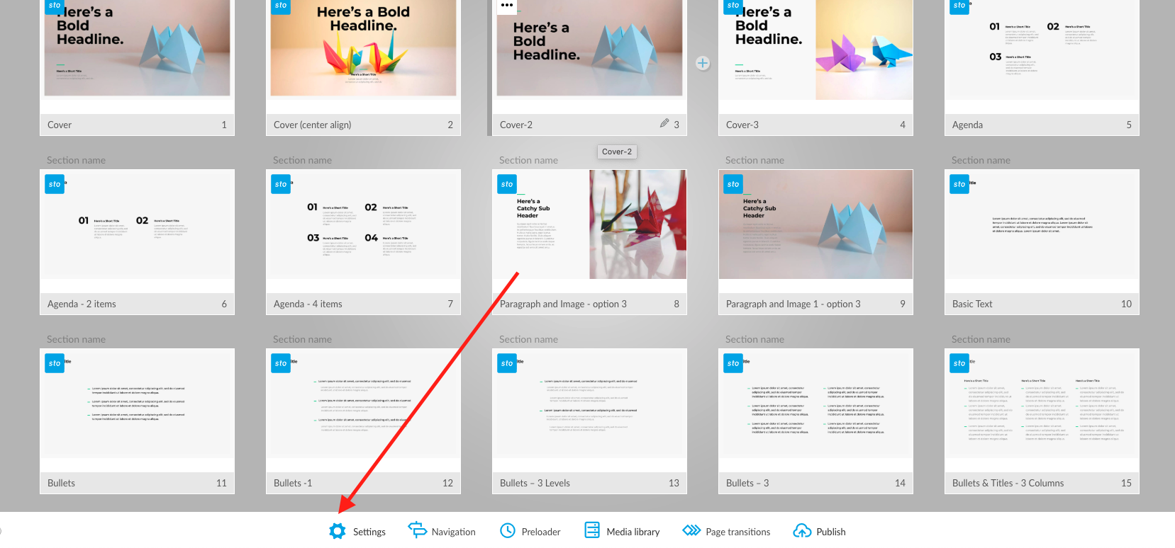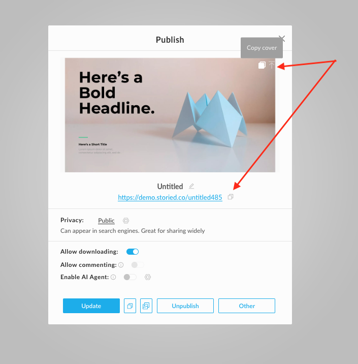 Your first thumbnail of your first page is your default cover image used in sharing. To customize a cover image for public sharing (e.g., on LinkedIn or Facebook), open your Project Settings tab, go to the Sharing options section, and upload your desired image.
